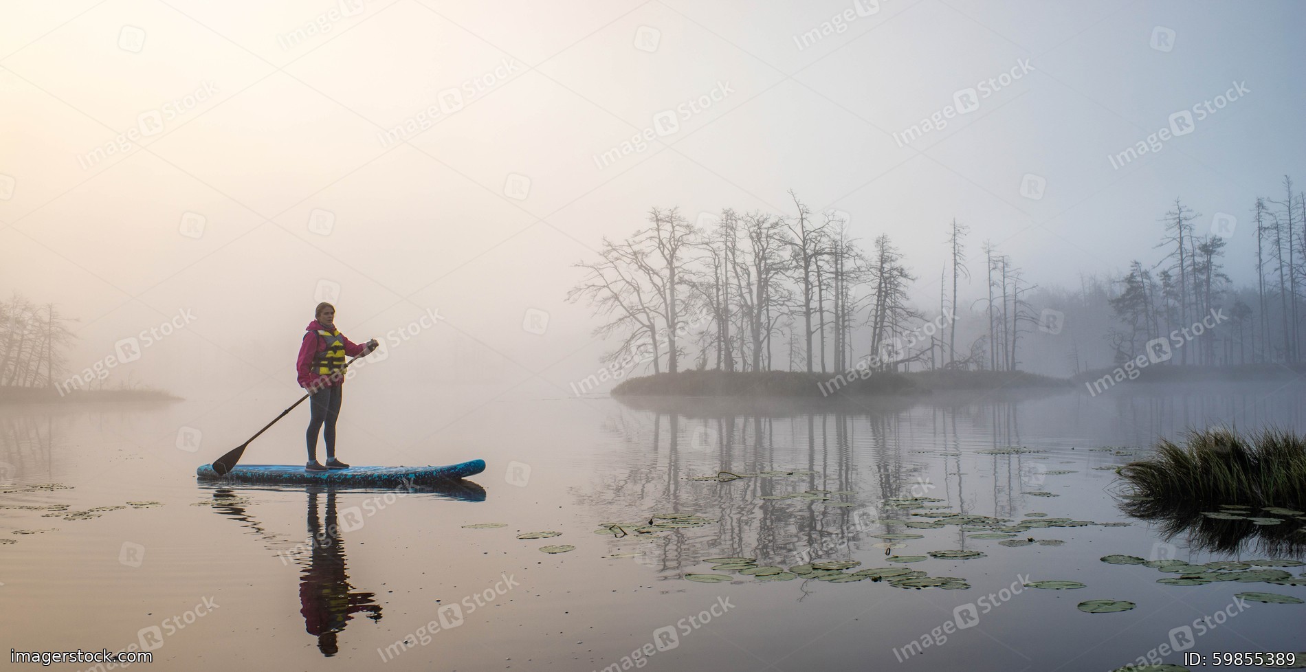 Woman slowly floating on the water on the sup-board. Fog and swamp.