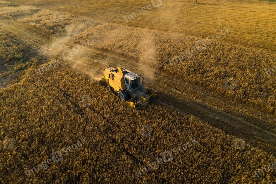 View from above. Combine harvester. Agricultural landscape.