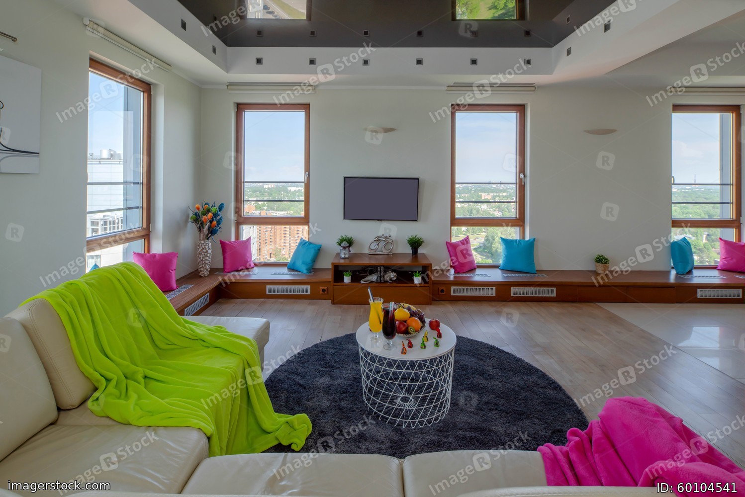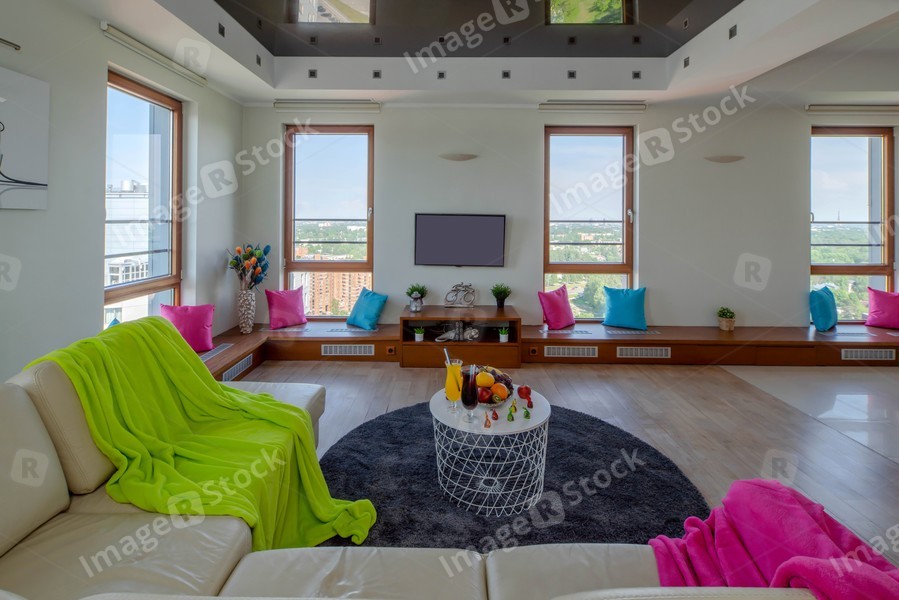 Modern interior of living room in apartment. Wall with windows and TV. Table with food and drinks.