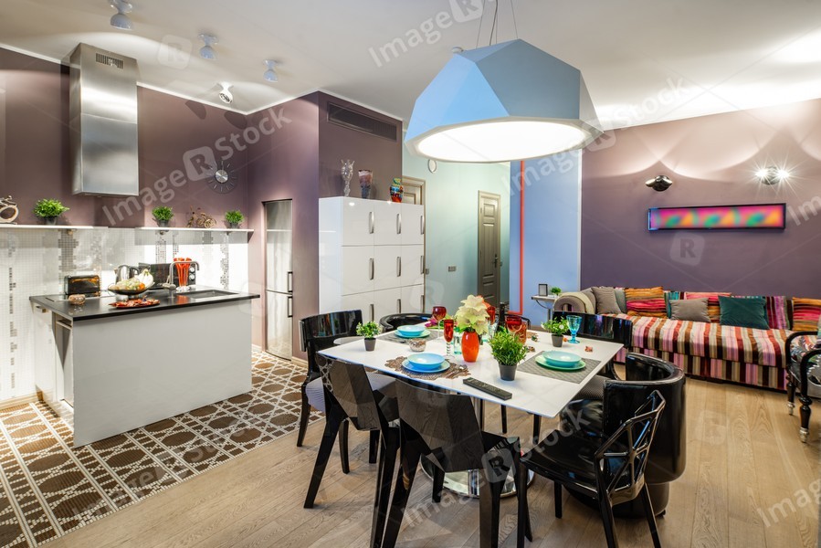 Living room. Set table. Cozy sofa. White cabinets. Studio apartment.