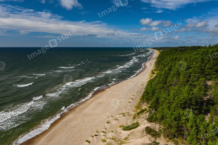 Top view of the seaside. Blue sky. Green forest.