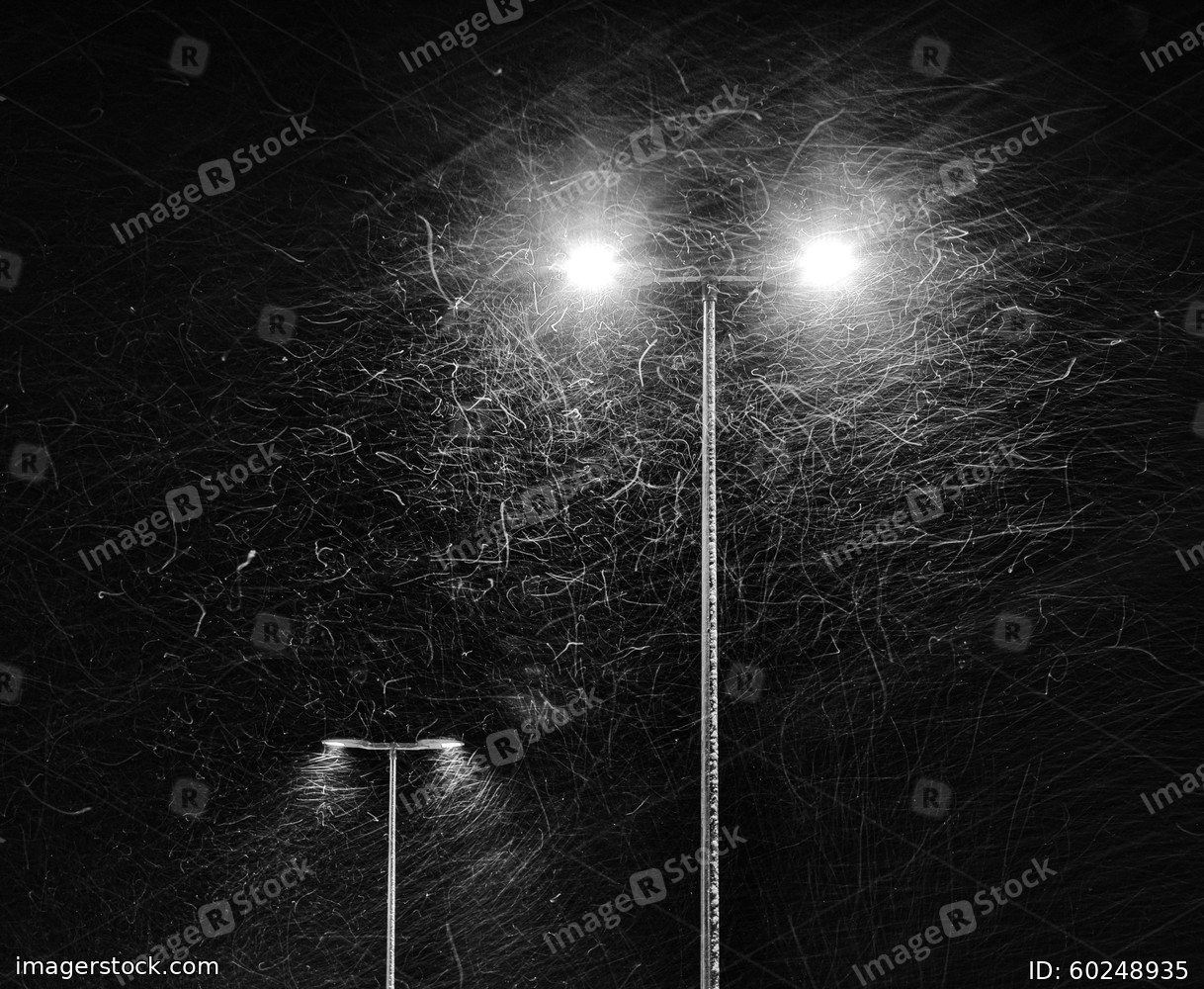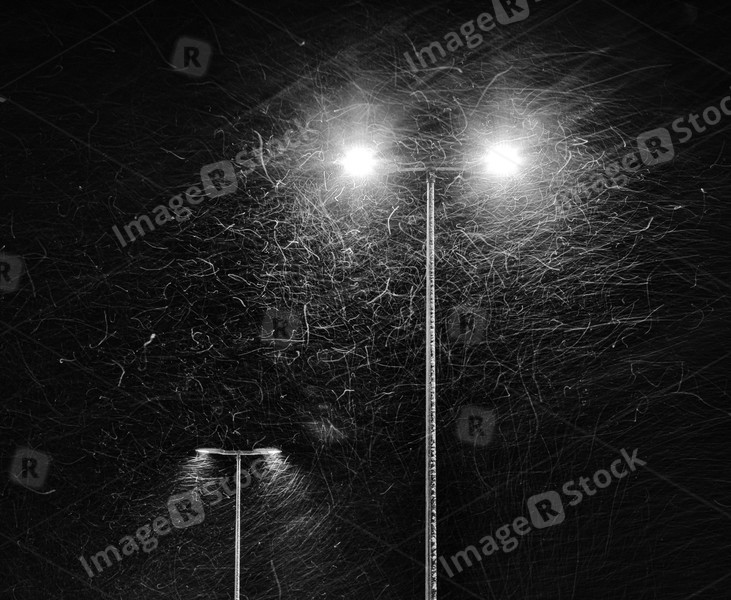 Snow falling on the background of a burning street lamp.