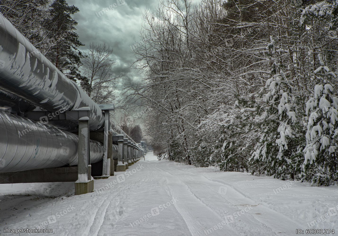 Huge industrial pipelines of central heating system. Snow on pipes.