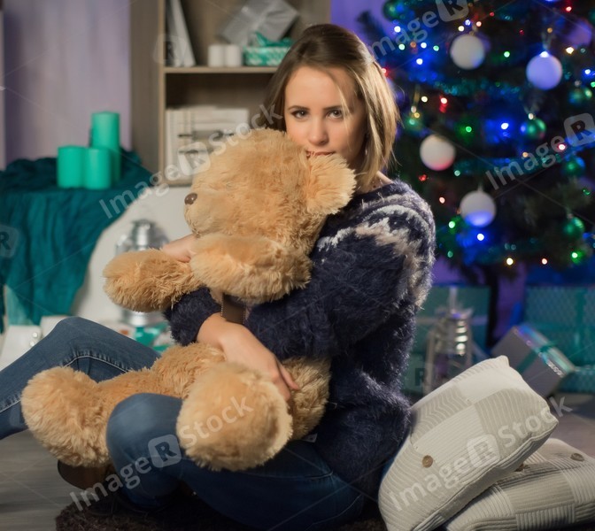 The girl with a toy bear on the background of the Christmas tree.