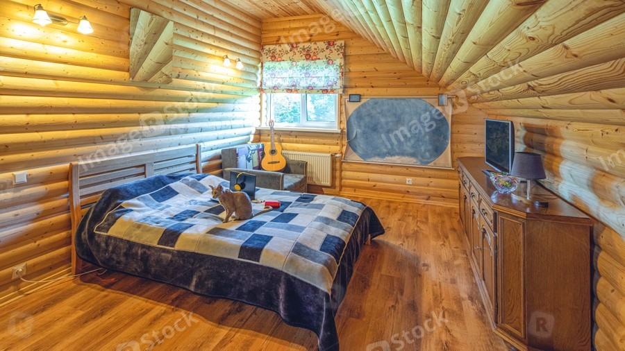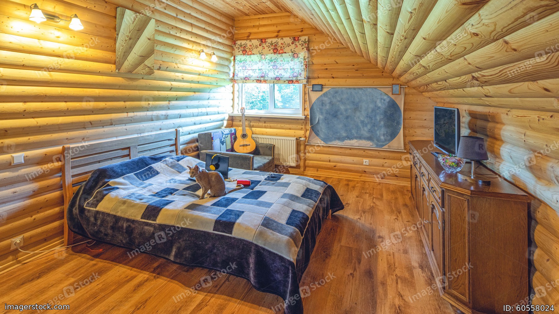 Eco wooden interior of attic bedroom in private country house. Soft cozy bed. Guitar on the chair. Child room.