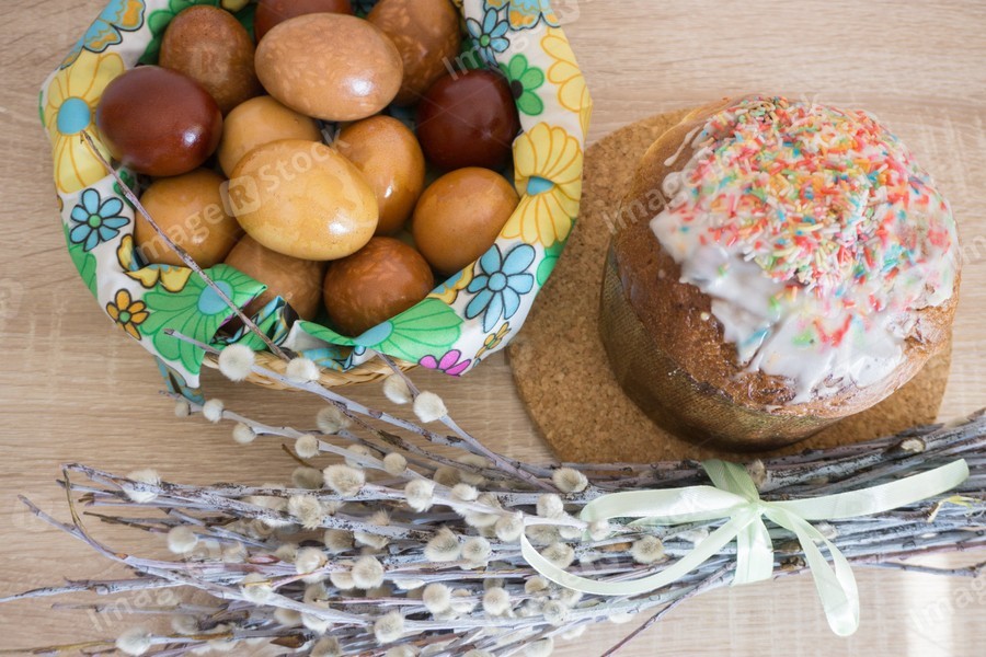 Interior decoration with willow, Easter cake and painted eggs
