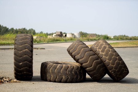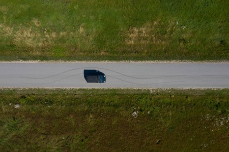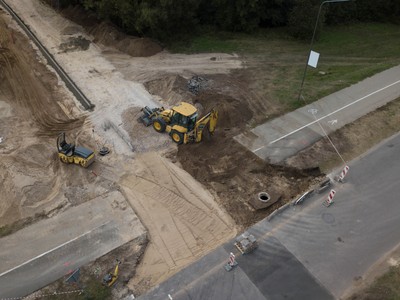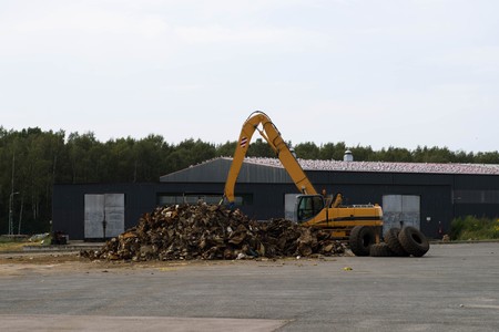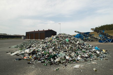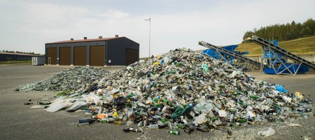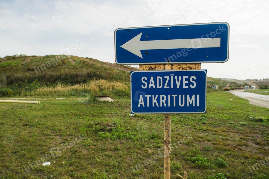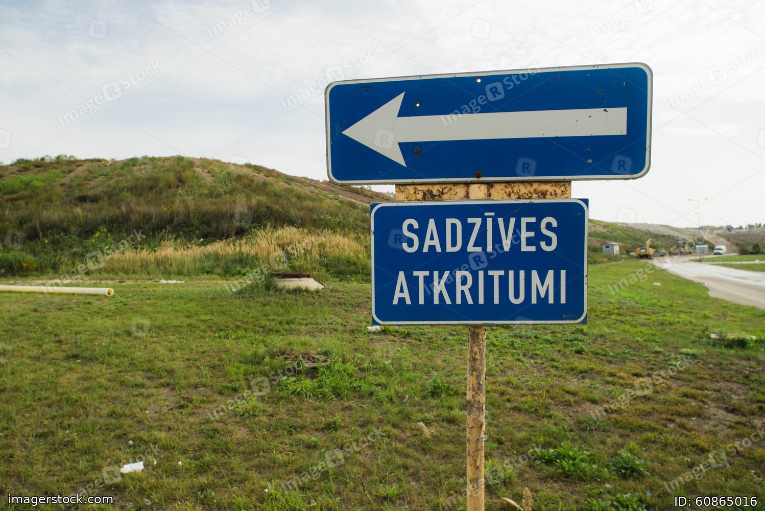 Blue road sign indicating direction. Latvian inscription "household waste". Green hill. Cloudy sky.
