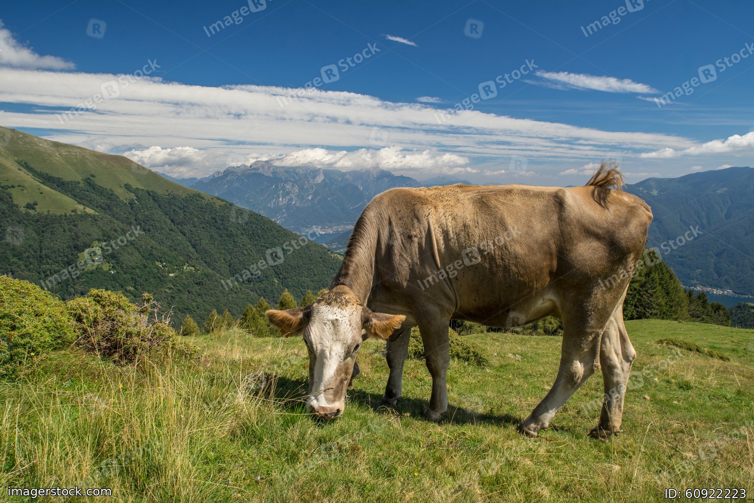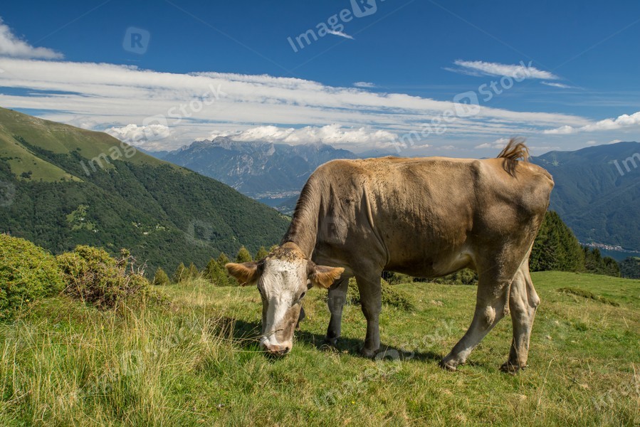 The pasture in the mountains. Cows grazing on the hills. Italy.