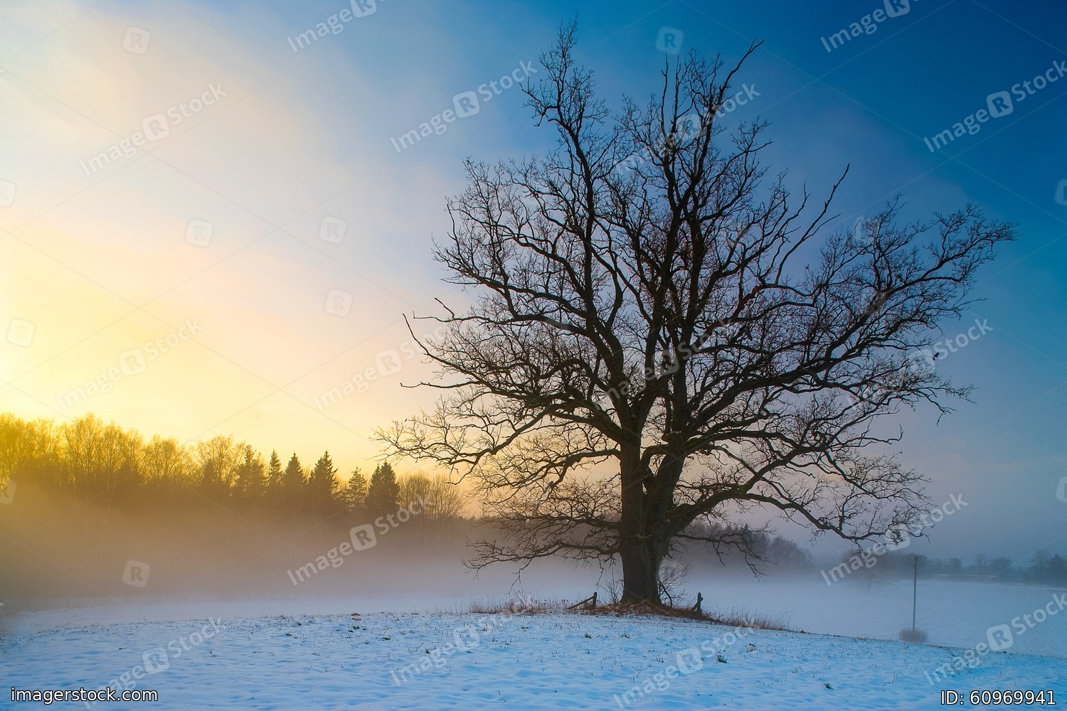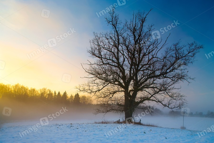 Winter landscapes, road, snow-covered trees. Blue sky.