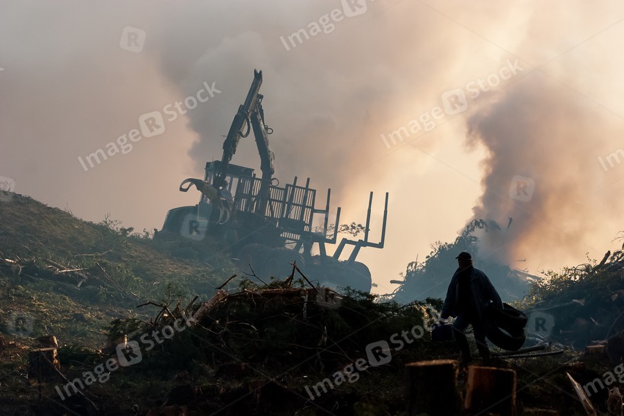 Forest cutting, burning of forest waste. Smoke and fire, tractor.