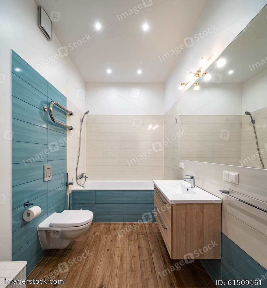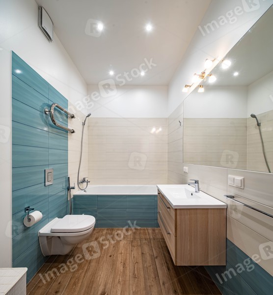 Modern interior of luxury bathroom. WC toilet. White bath and sink. Blue and beige tile.