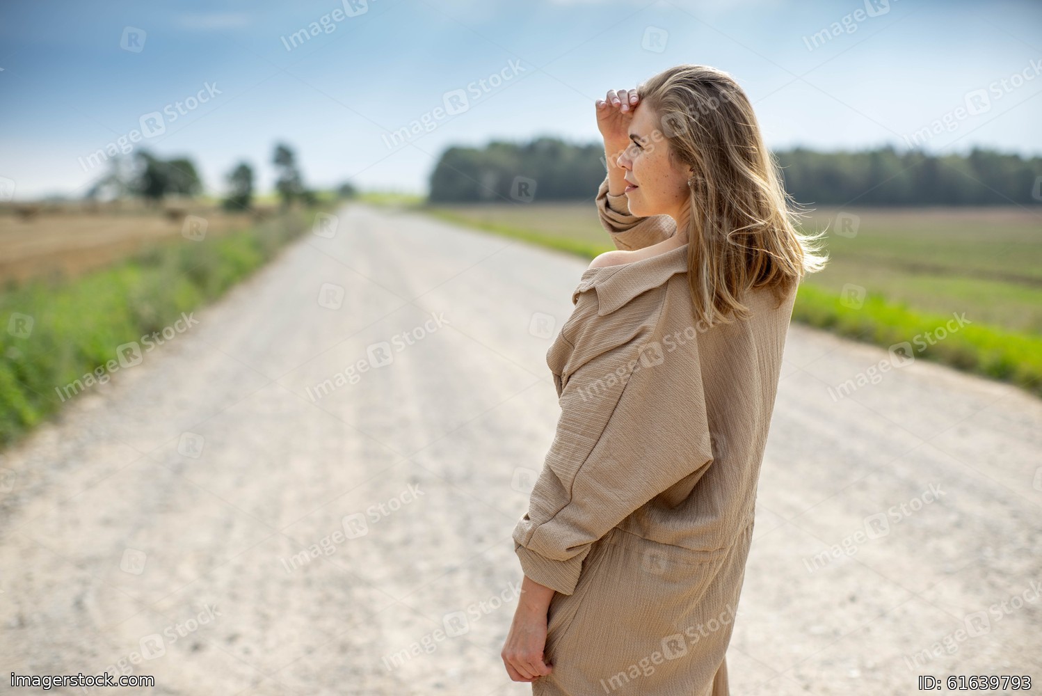 Woman in dress is walking on the road. Summertime.