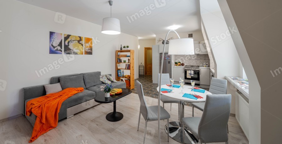 Spacious studio apartment with furniture. Living room. Kitchen. Light interior.