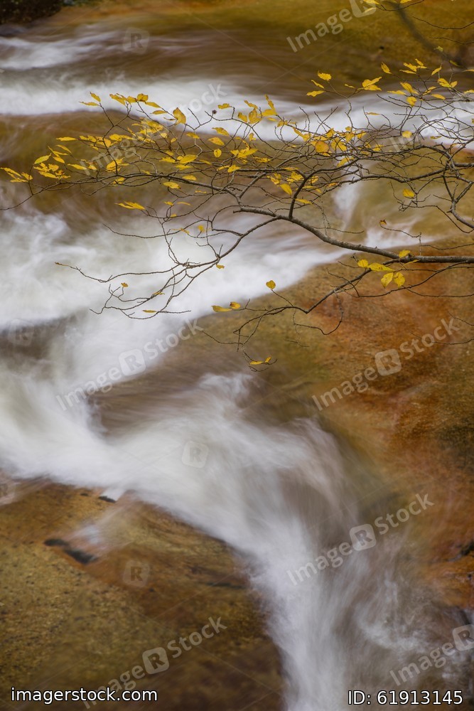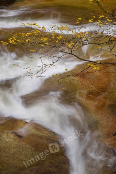 Autumn yellow forest and stone river stream.