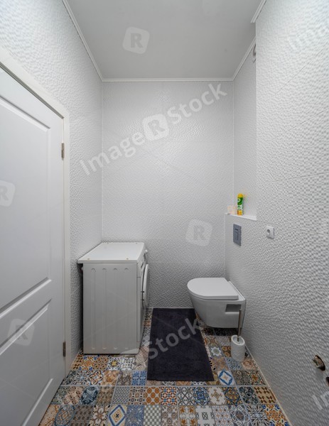 Toilet room with washing machine and carpet.