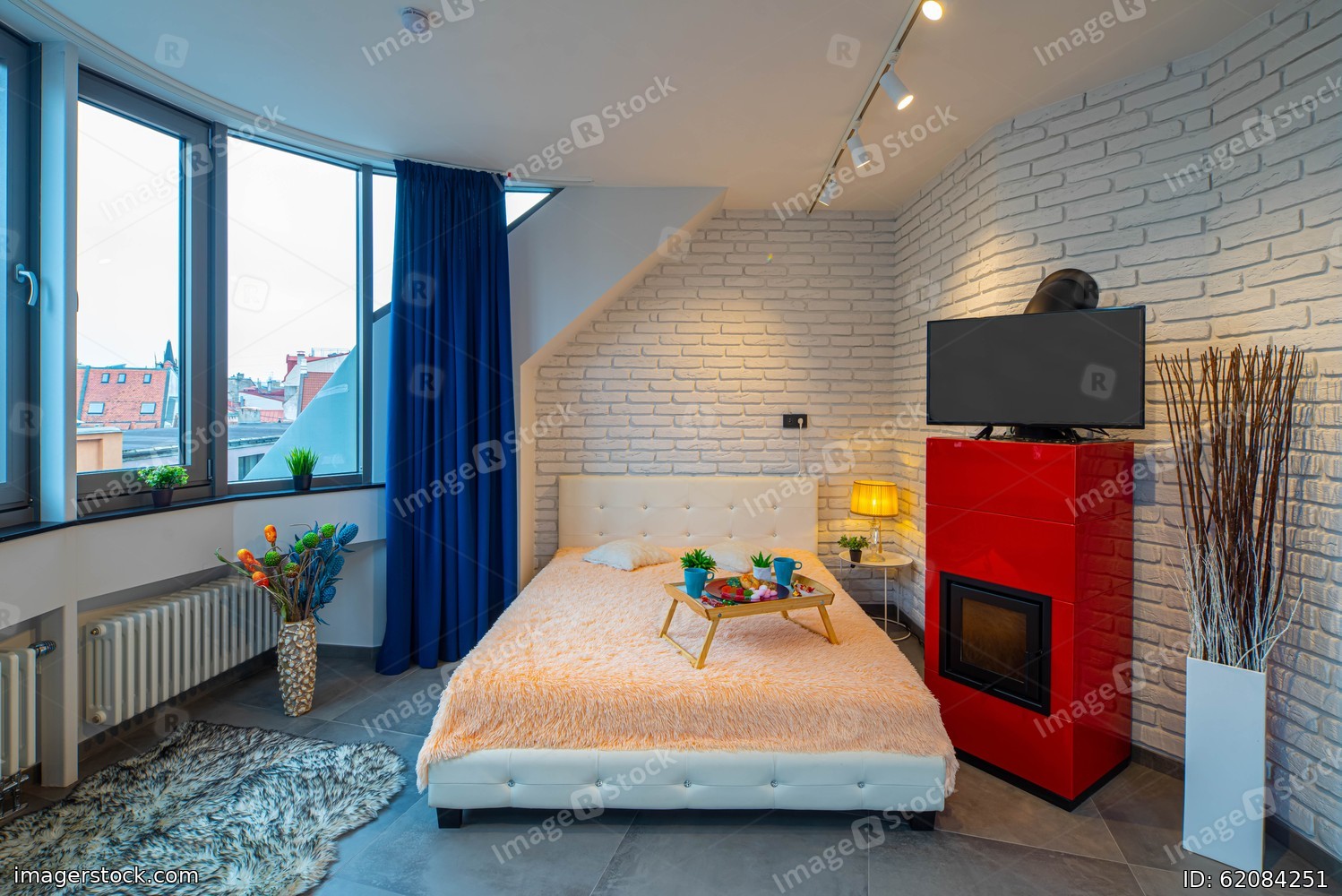 Loft interior of flat. Studio apartment. Panorama windows. Brick wall. Cozy bed with tray. TV on the modern fireplace. Front view.