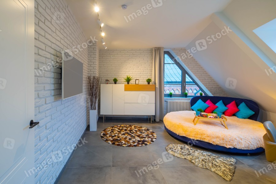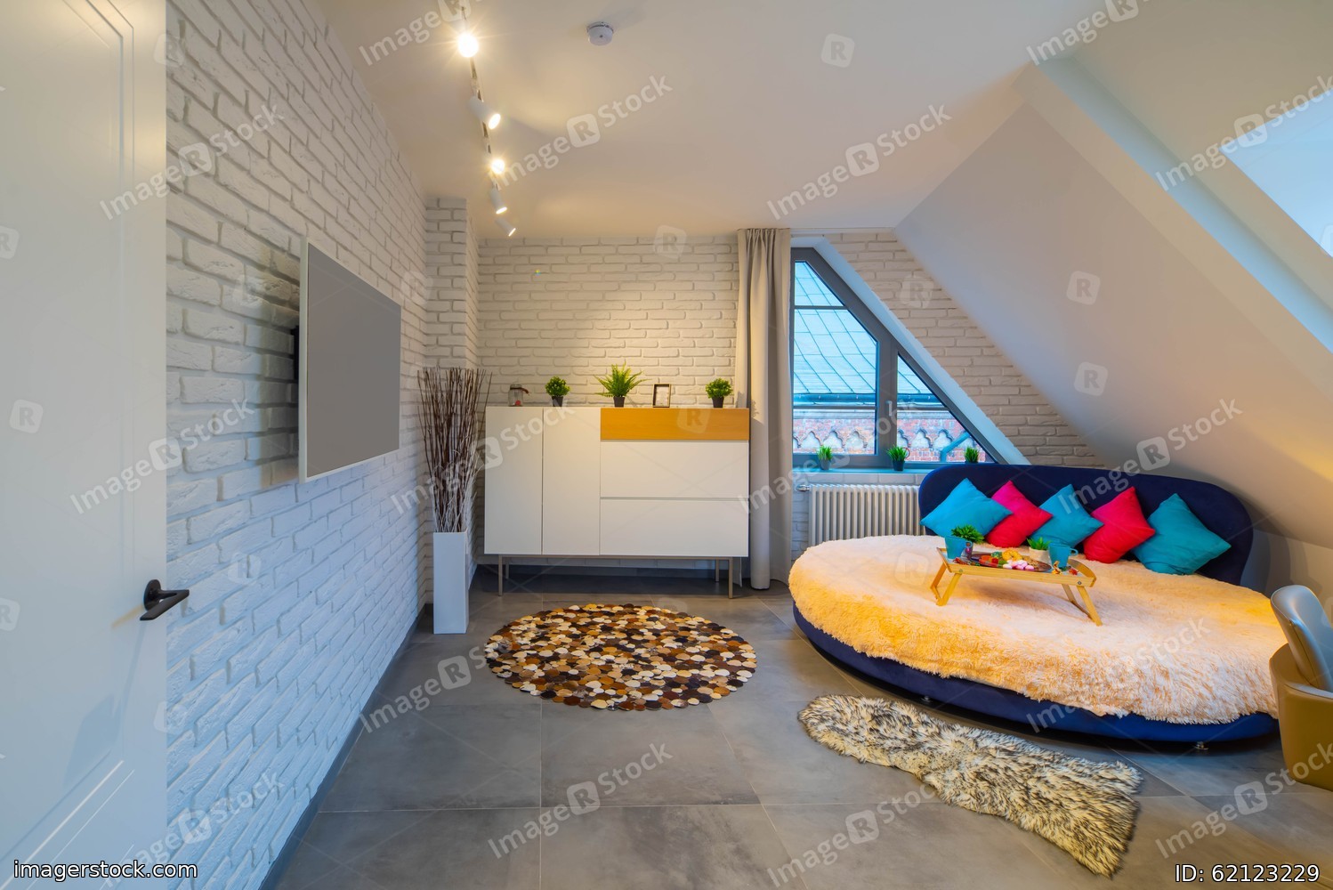 Loft interior of bedroom in modern apartment. Tray on the round bed. TV on the brick wall. Home decor.