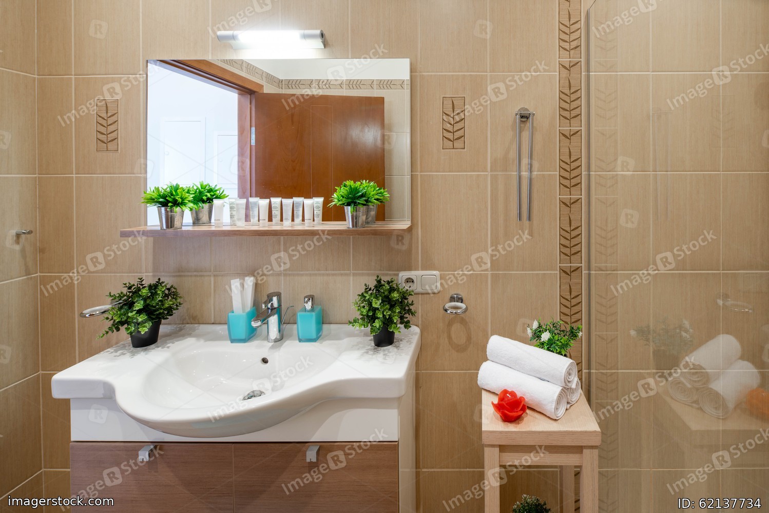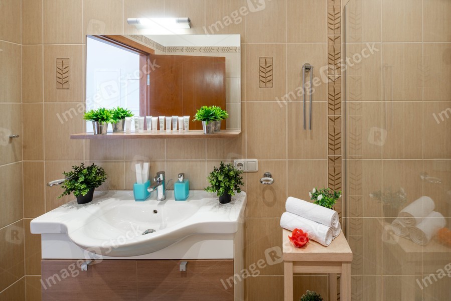 Modern luxury interior of bathroom. White sink, mirror and shelf with cosmetics.