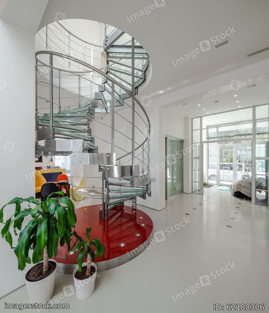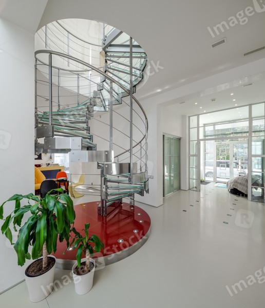 Spiral staircase made of metal and glass in luxury private house.