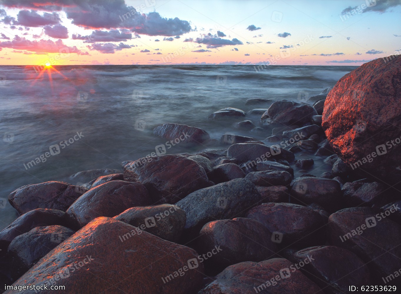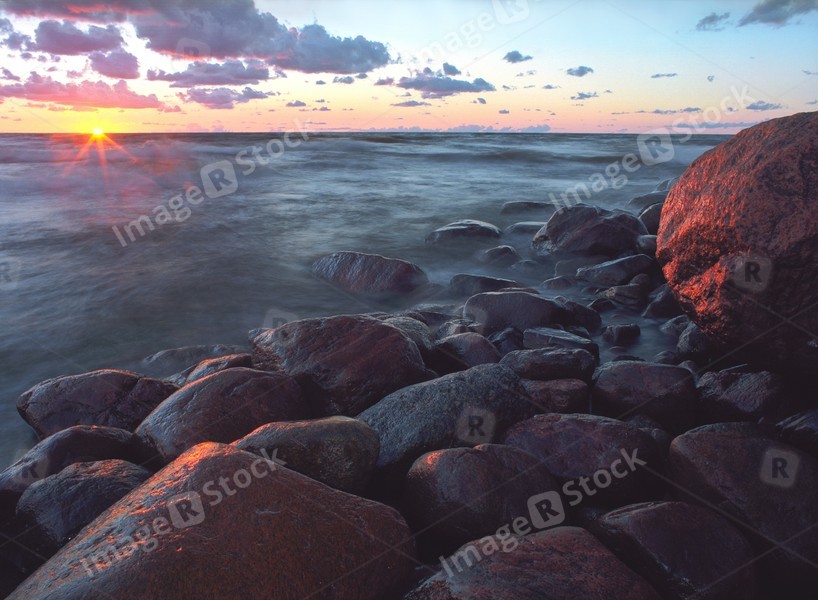 Rocky shore. Stones in the sea waves. Beautiful clouds. Sunset.