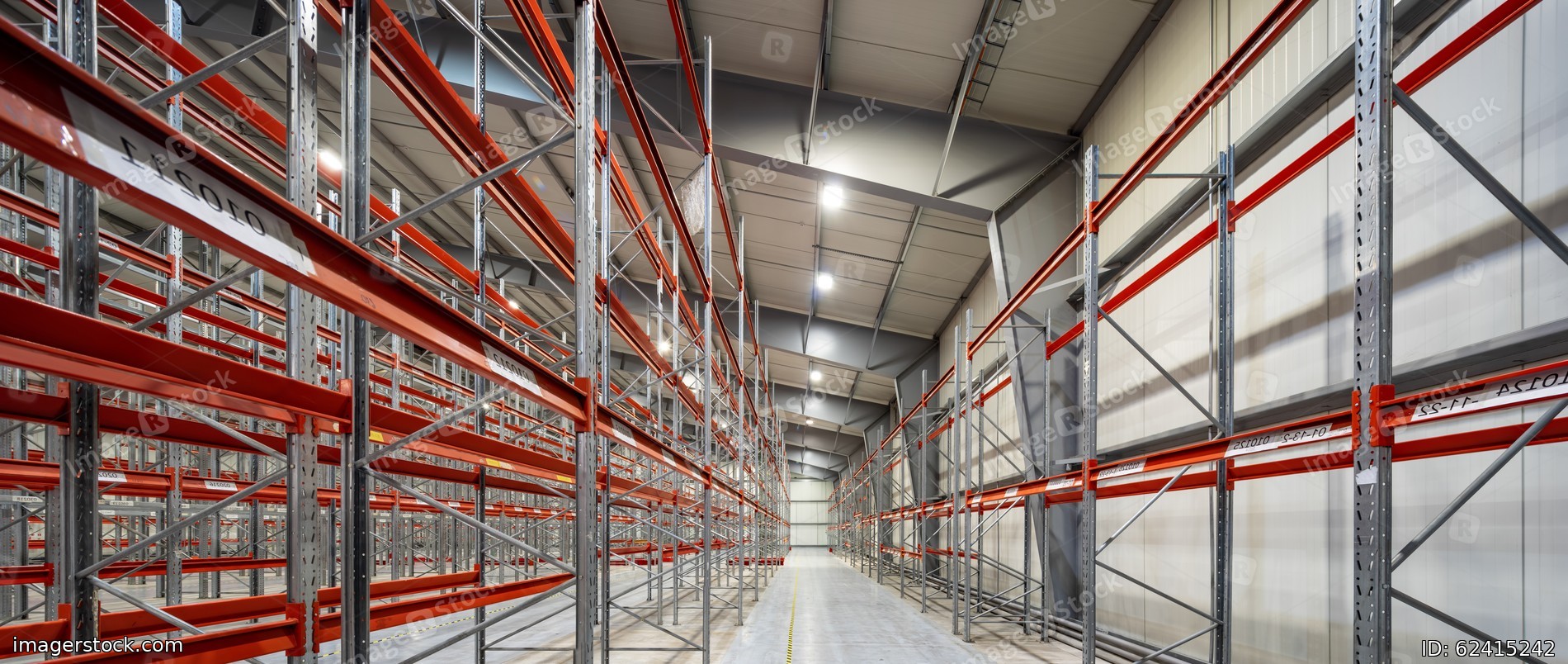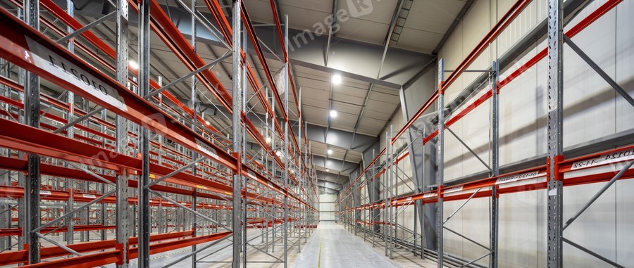 Interior of huge empty storehouse. Industrial warehouse racking.