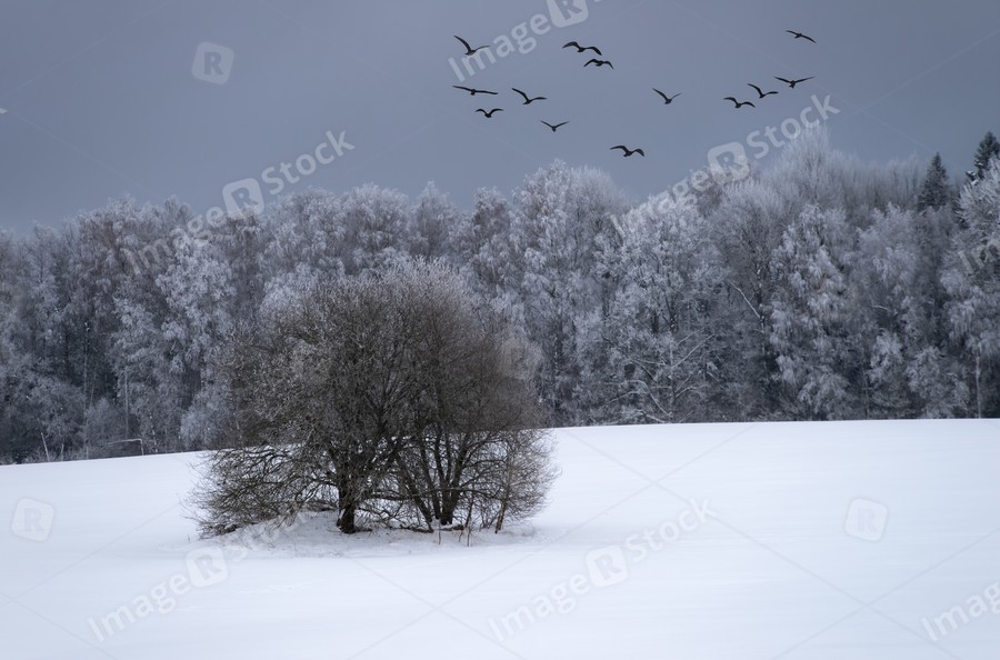 Beautiful winter landscape. Snowy forest. Birds in sky.