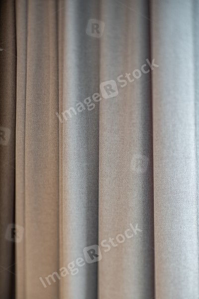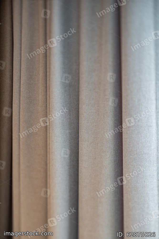 Close-up of grey curtains. Fabric texture. Modern interior.