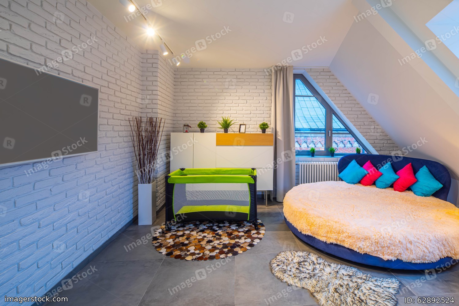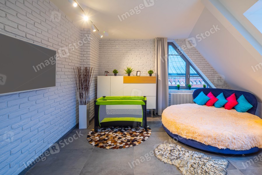 Modern loft interior of bedroom in apartment. Cozy round bed. TV on the white brick wall. Playpen. Home decor.