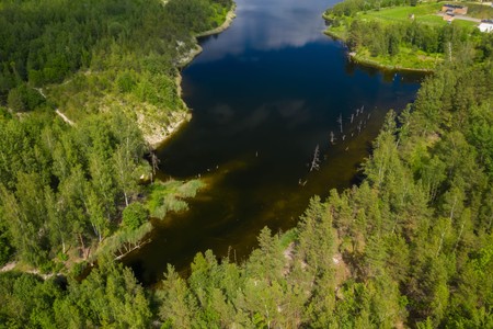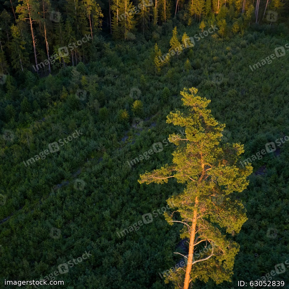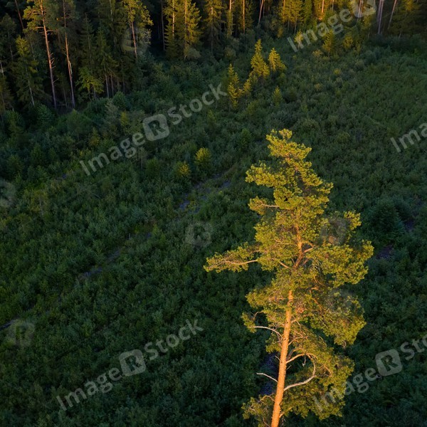Top drone view of summer pine and spruce forest. Close-up of green tree in sunset light.