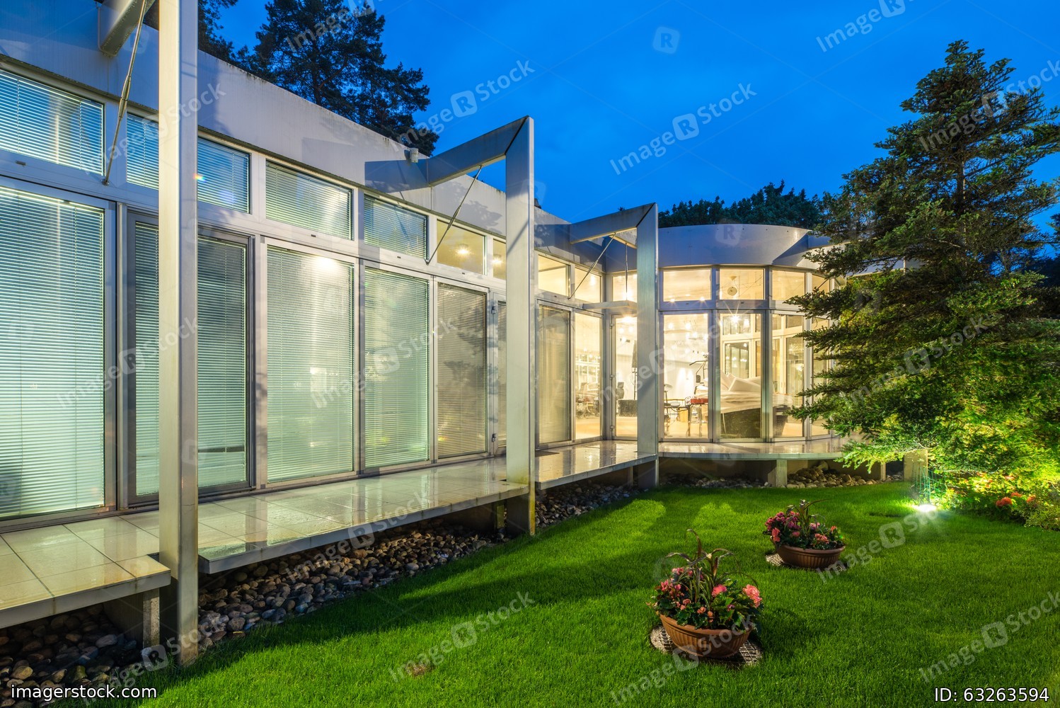 Modern exterior of luxury private house at twilight. Beautiful garden.