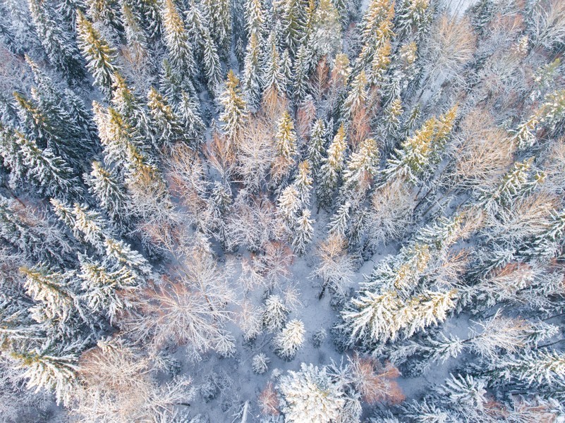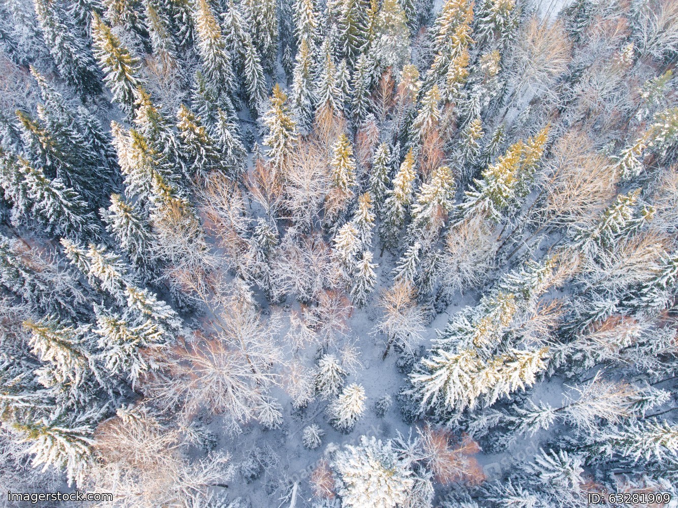 Aerial view of scenic winter forest. Beautiful nature. Trees and snow.