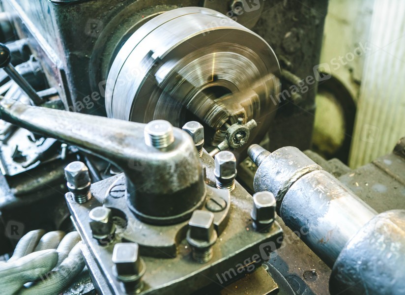 Metalwork equpment. Close-up of lathe and worker`s hand. Thread cutting on a stud.