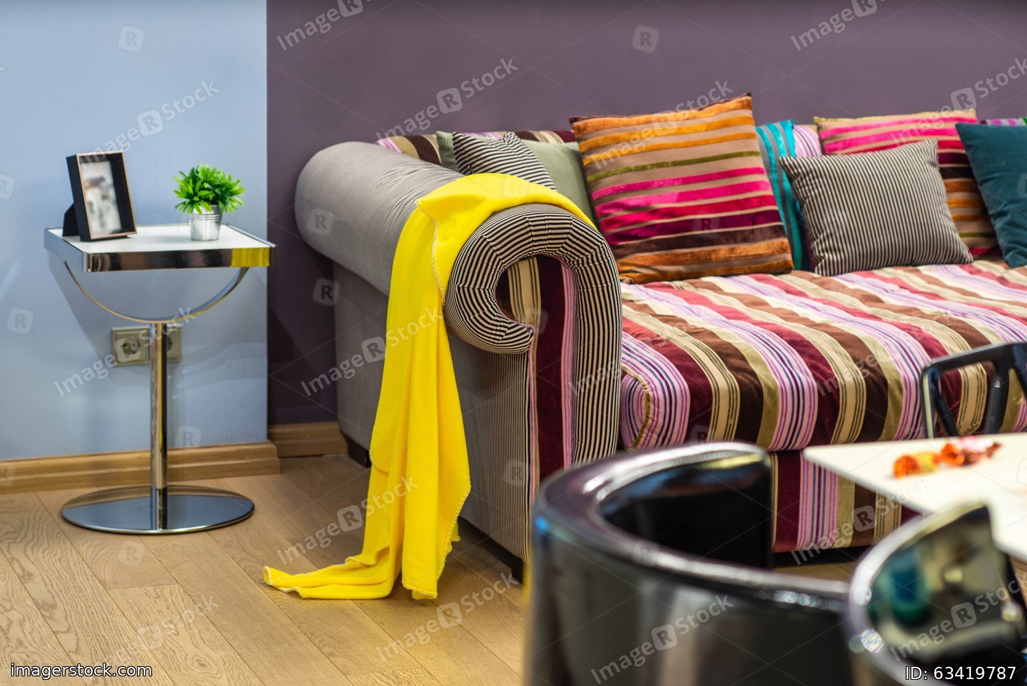 Close-up of cozy couch with pillows and yellow plaid. Stripes.