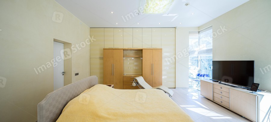 Yellow interior. Bedroom in luxury apartment. Cozy bed and TV.