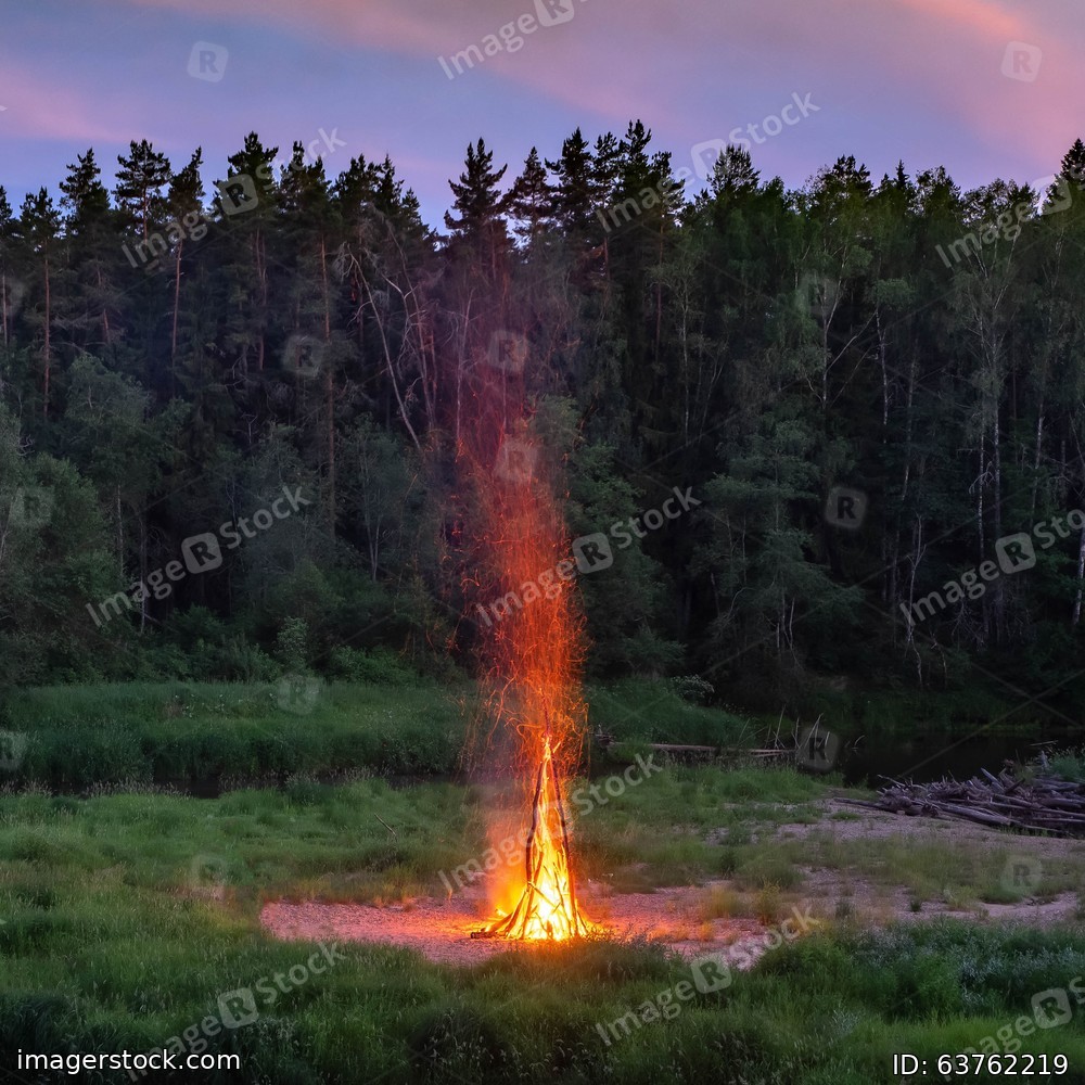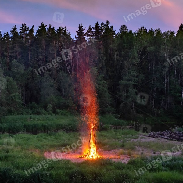 Landscape of pine forest and river. Sunset sky. Huge fire. Midsummer Ligo celebration. Latvian traditions.