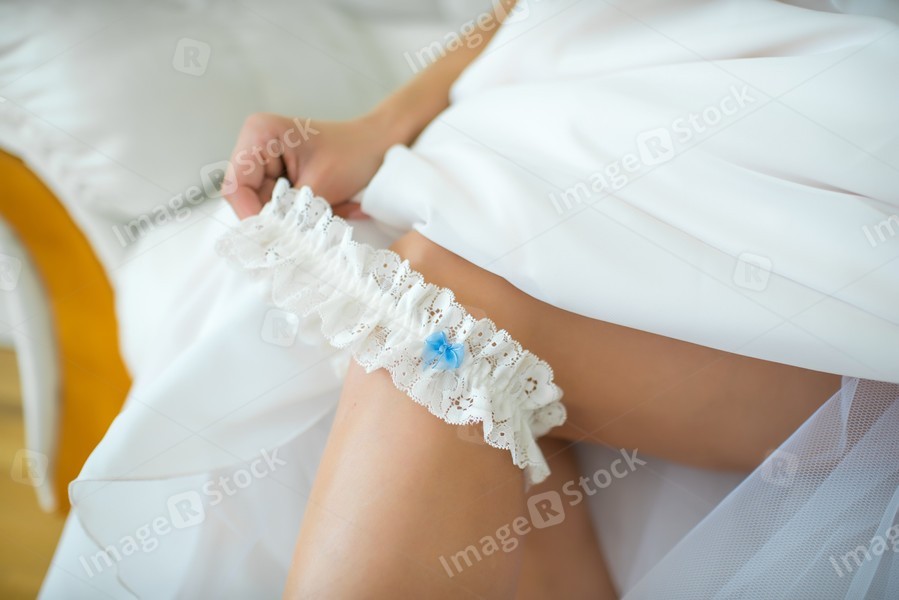 The bride in a white dress wearing a garter before the wedding.