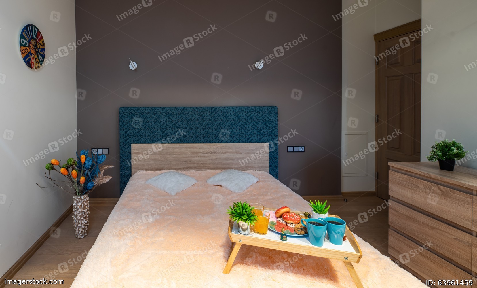 Interior of bedroom. Modern apartment. King-size bed. Tray with food.