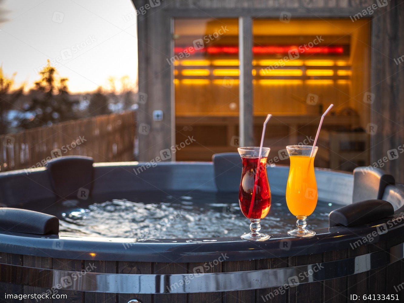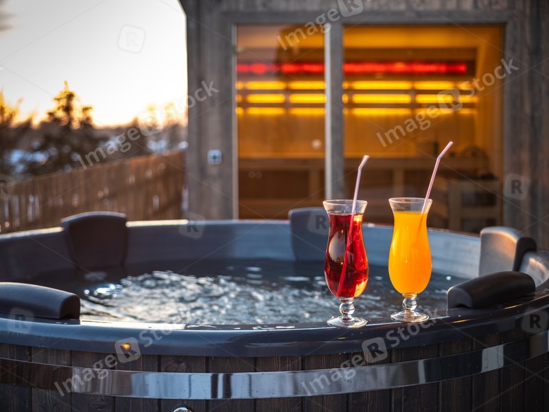 Hot outdoor wooden bath tub on terrace of private house. Finnish sauna