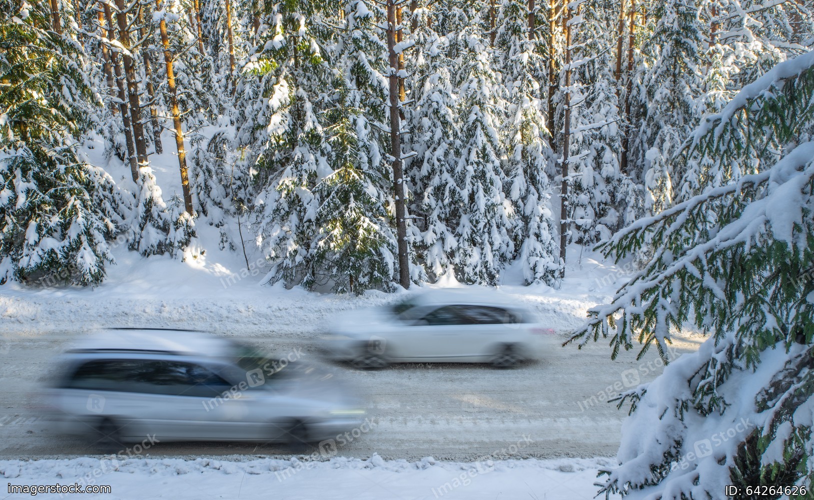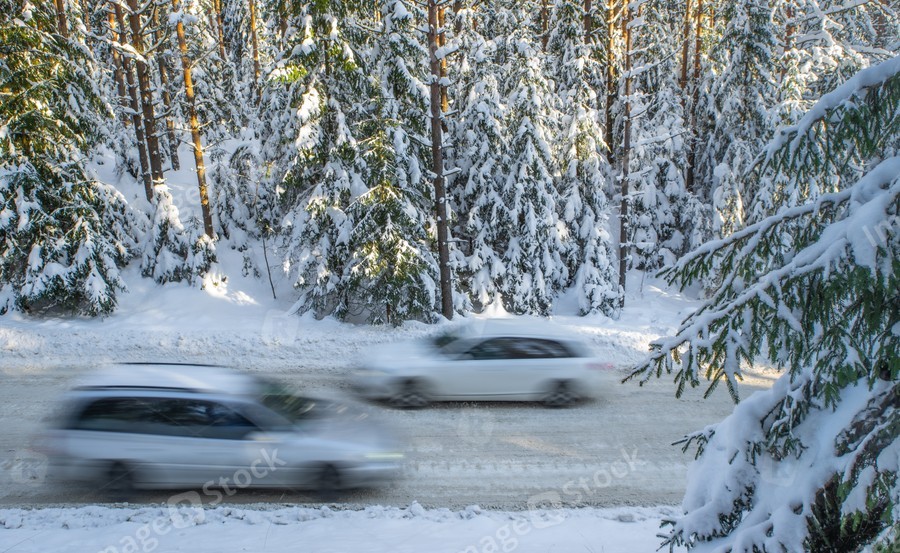 Scenic landscape of winter forest. Trees covered by snow. Car on road.