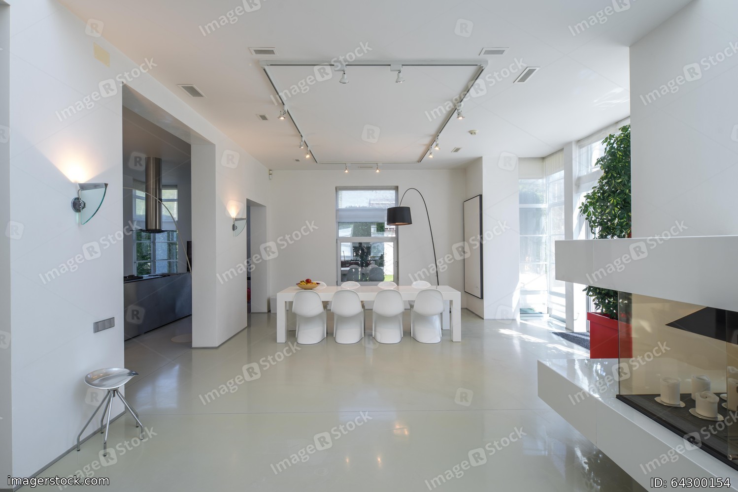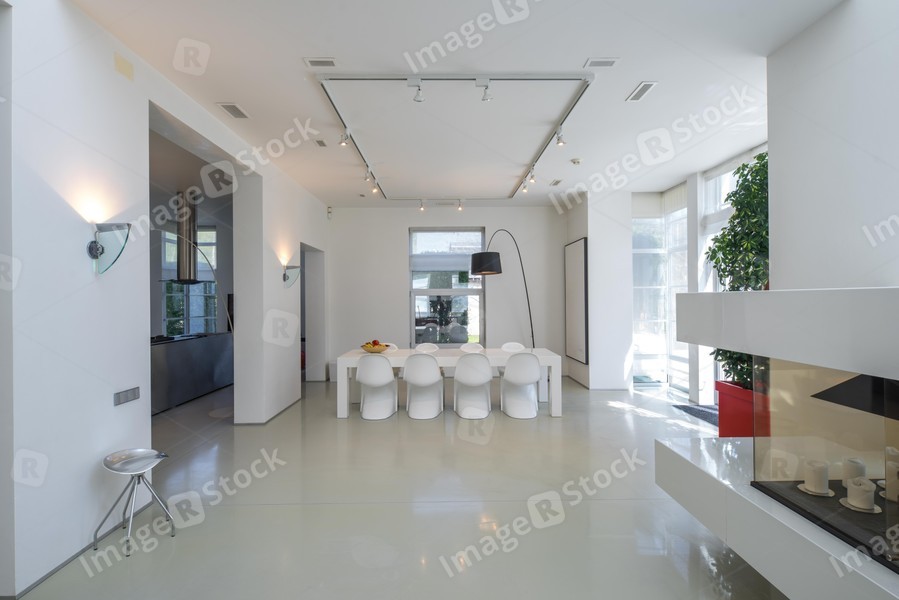Modern interior of spacious living room with dinner table.