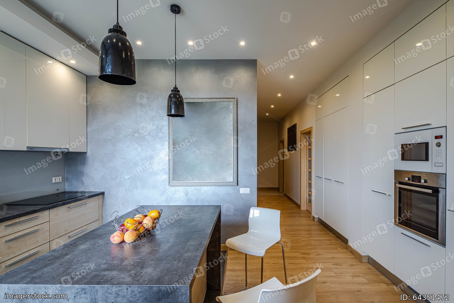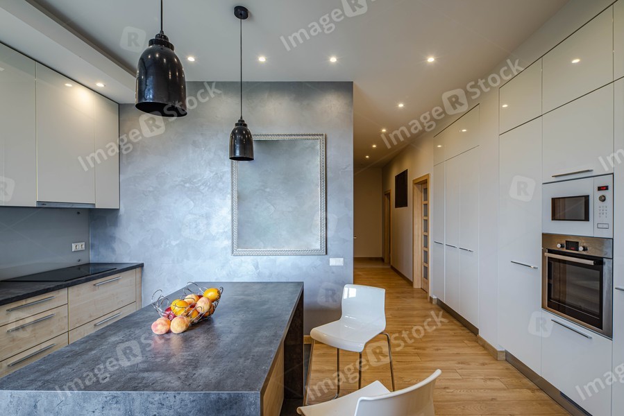 Contemporary interior of kitchen in luxury flat. Wooden kitchen table with dark counter. Built-in kitchen set with oven. Hallway.