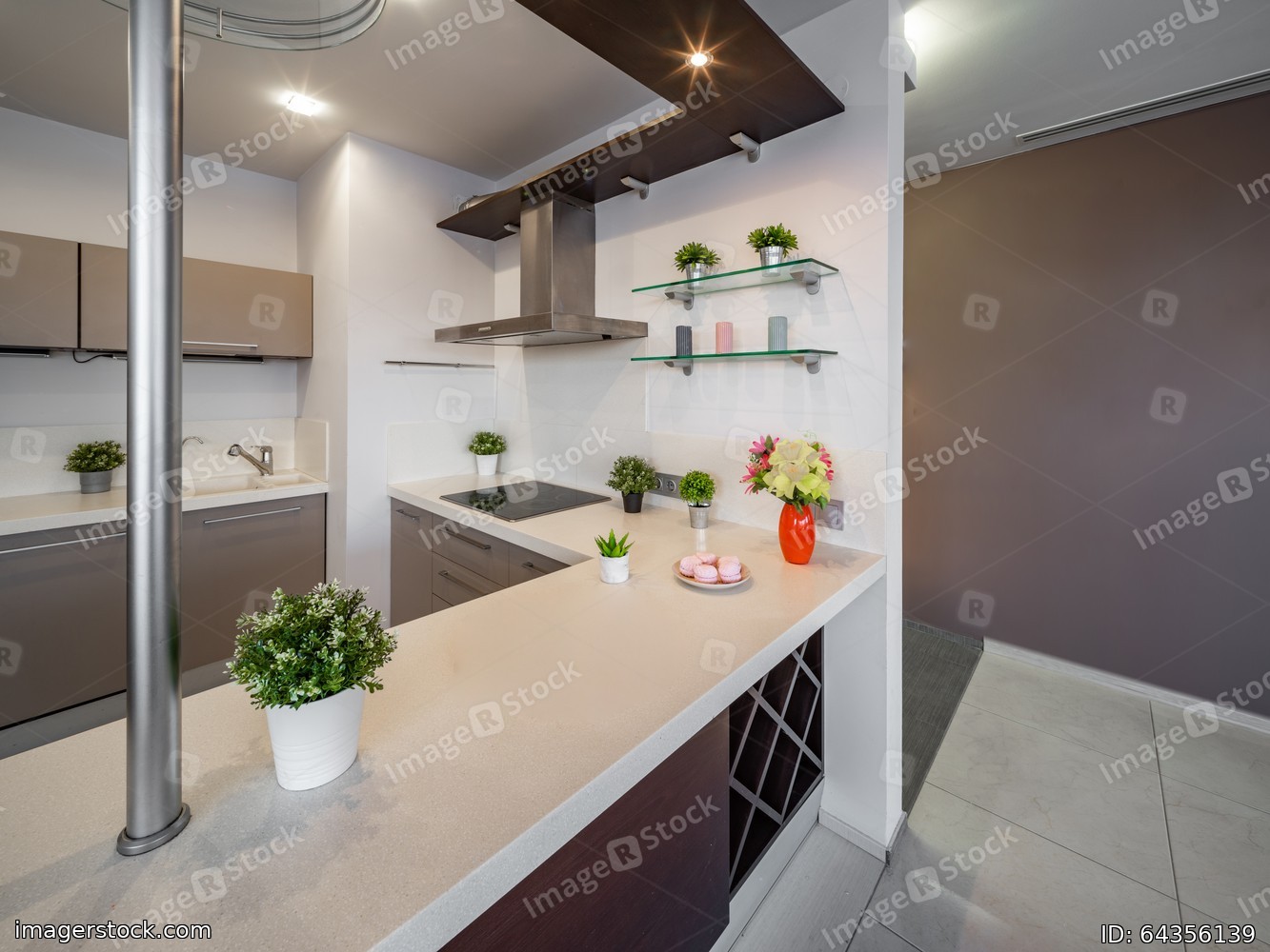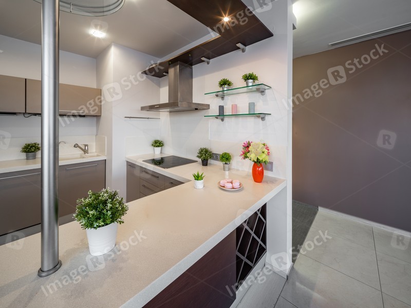 Modern interior of kitchen in luxury studio apartment.