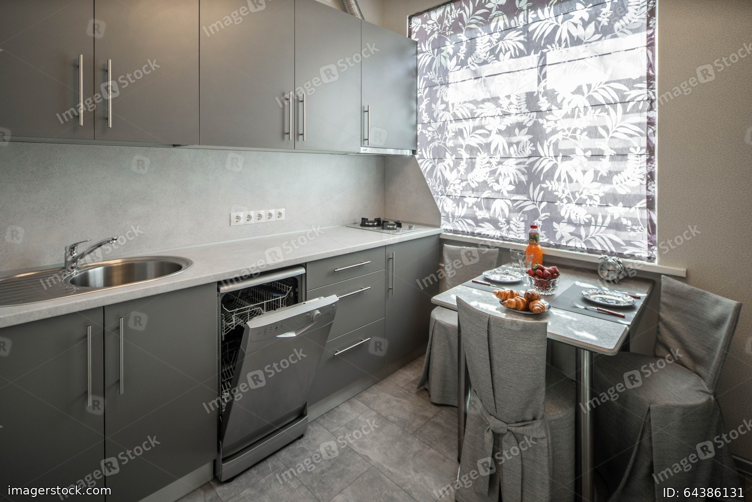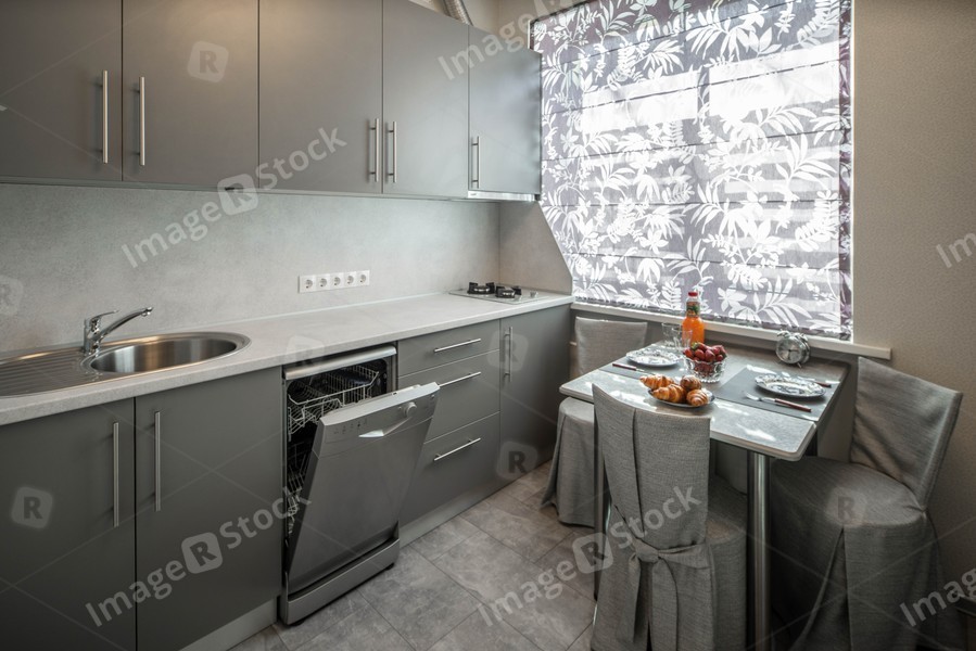 Laid table in modern kitchen. Interior in shades of grey.