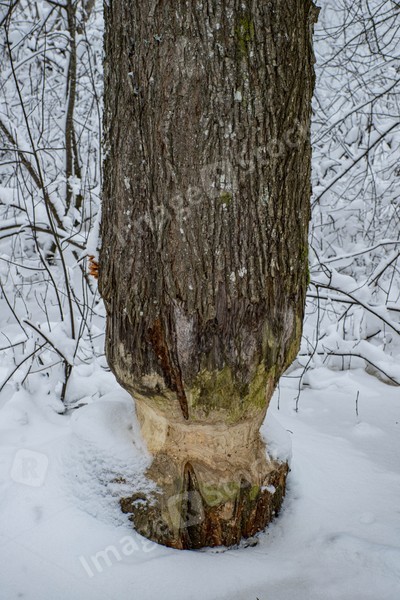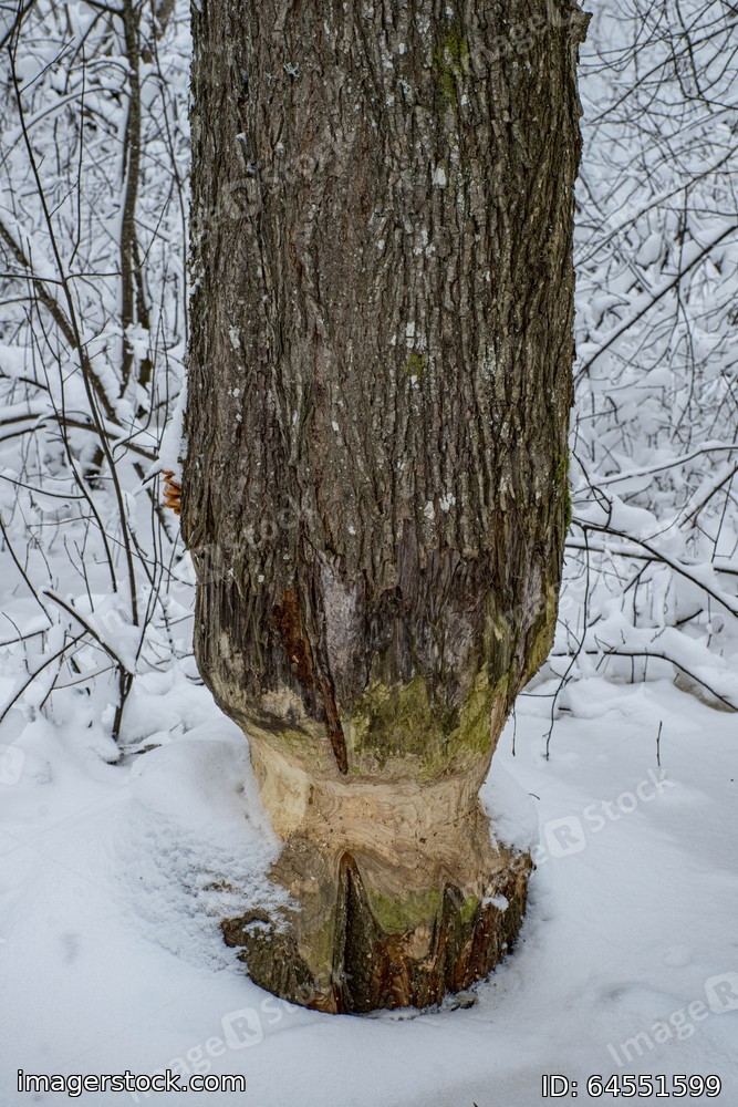 Old tree trunk gnawed by a beaver. Wild nature. Winter forest. White snow. Close-up.