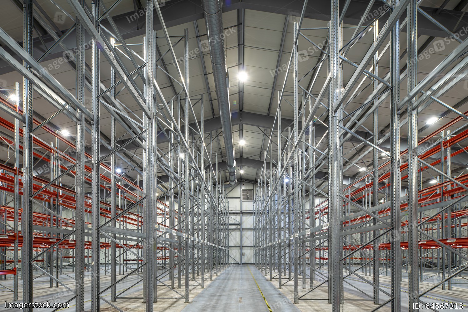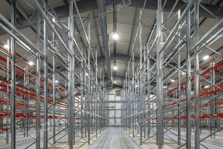 Interior of huge empty storehouse. Industrial warehouse racking.