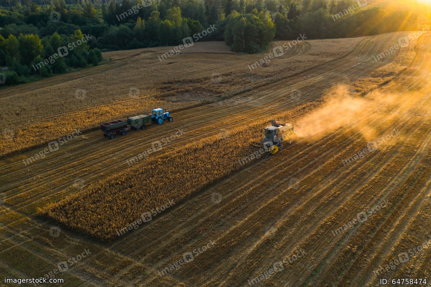 Top view of Combine harvester harvesting golden wheat field and the tractor in sunlight rays.
