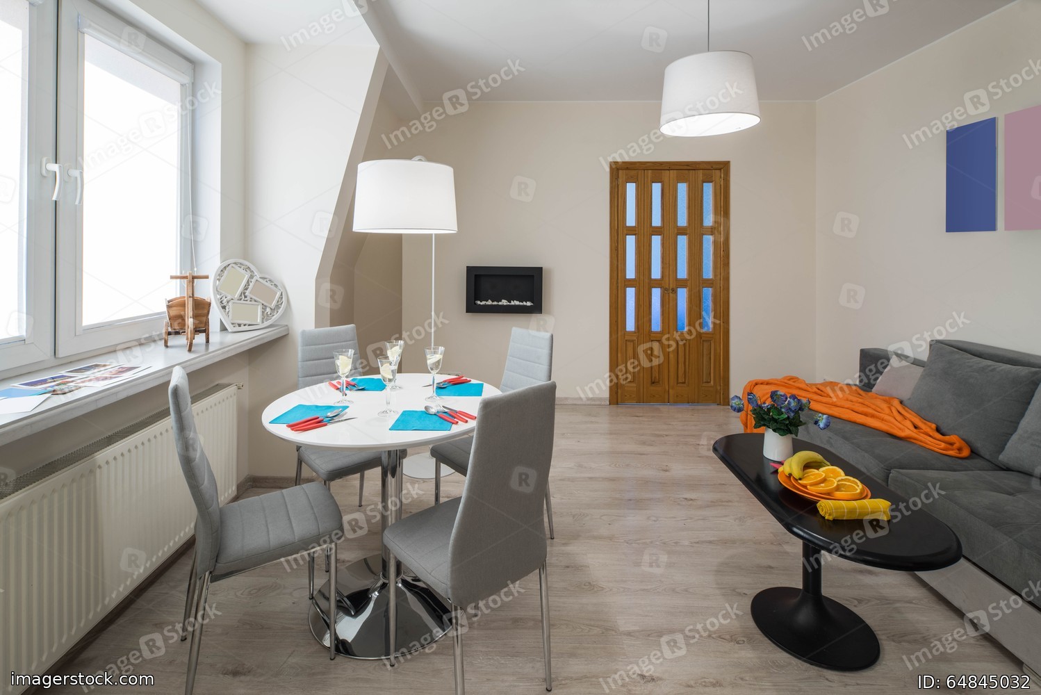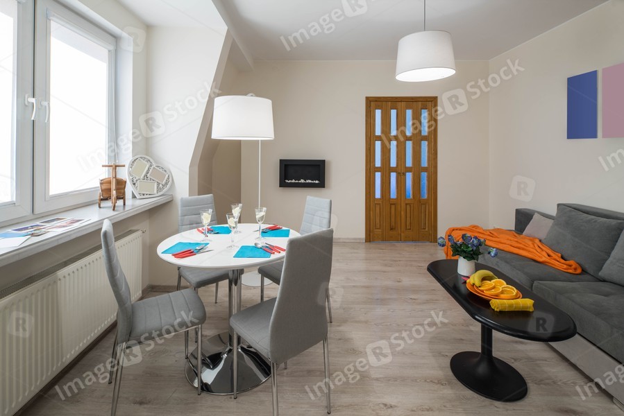 Light interior of living room. CLosed door. Cozy couch. Table and chairs.