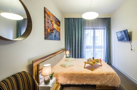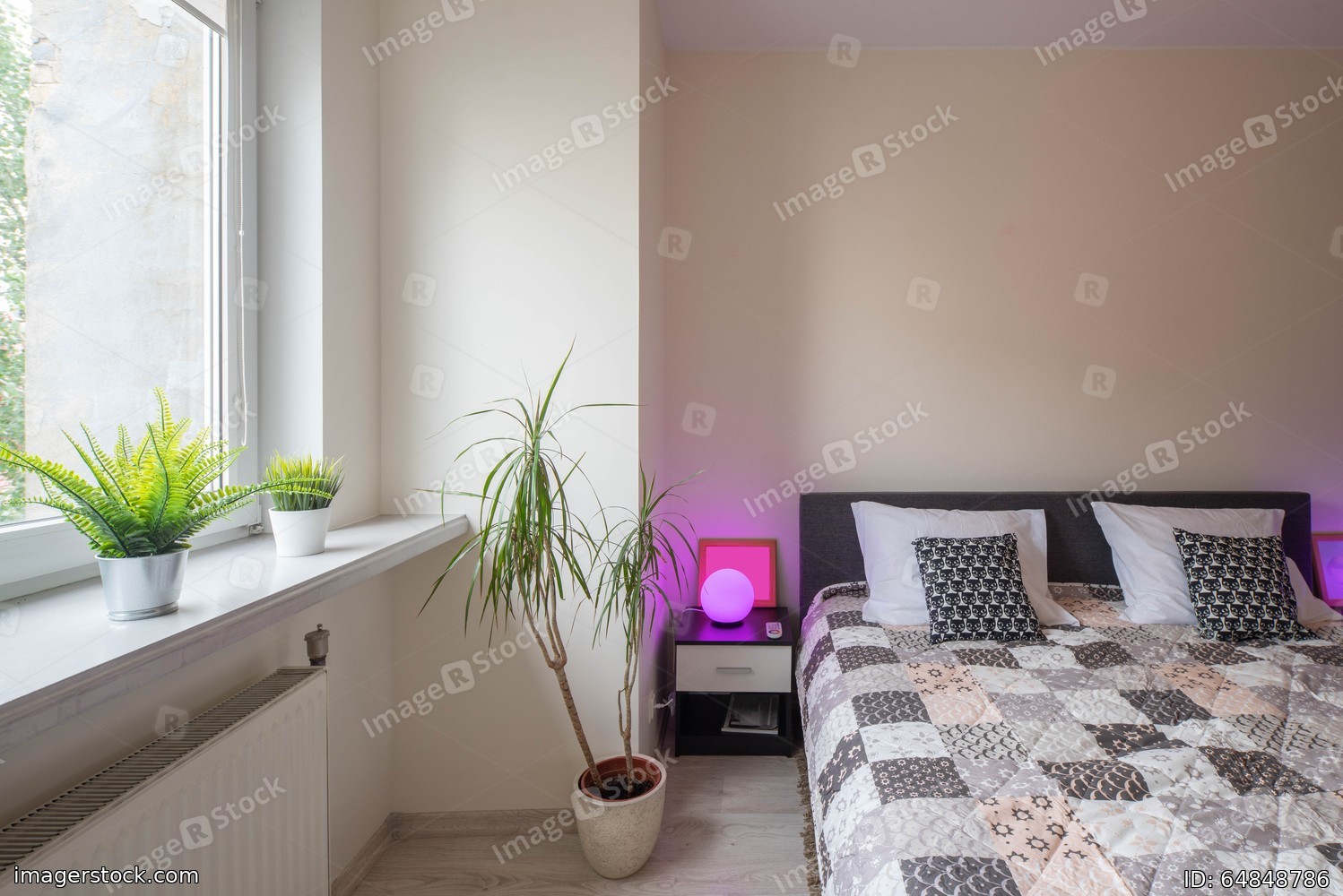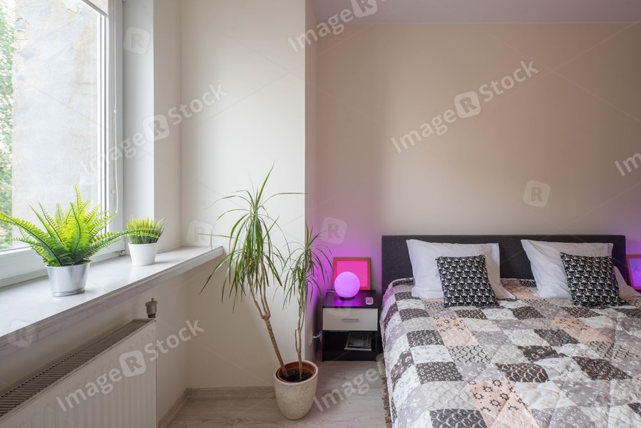 Modern interior of bedroom. Bed with pillows and blanket. Bedside with pink lamp.