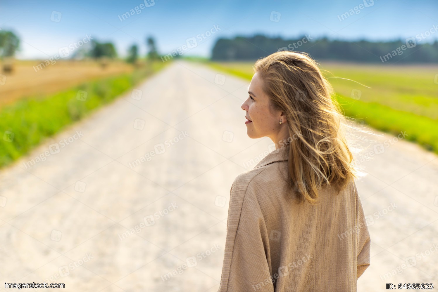 Woman in dress is walking on the road. Summertime.