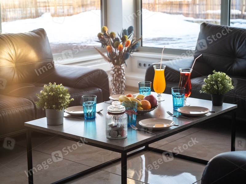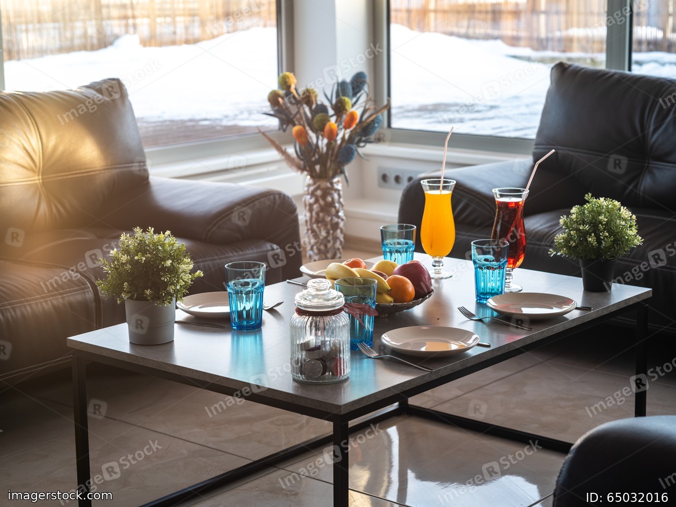 Close-up of table. Leather sofas. Plates and glasses. Fruits on plate.